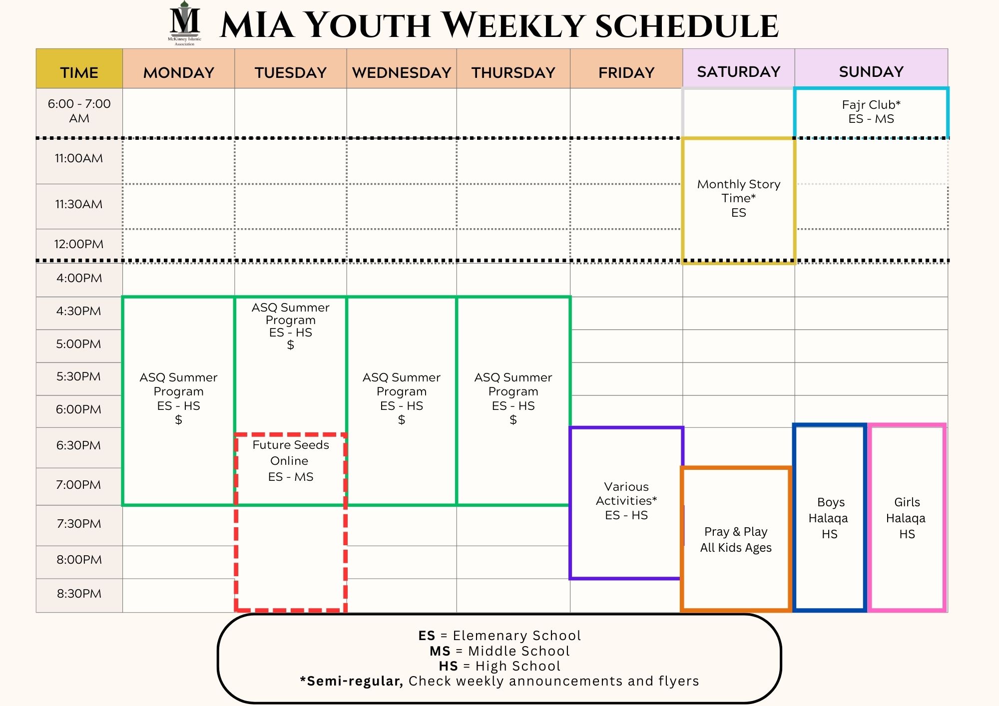 Alhumdulillah, we’re excited to share our weekly schedule for MIA Youth! This includes ongoing programs designed to keep our youth engaged, connected, and growing inshallah!